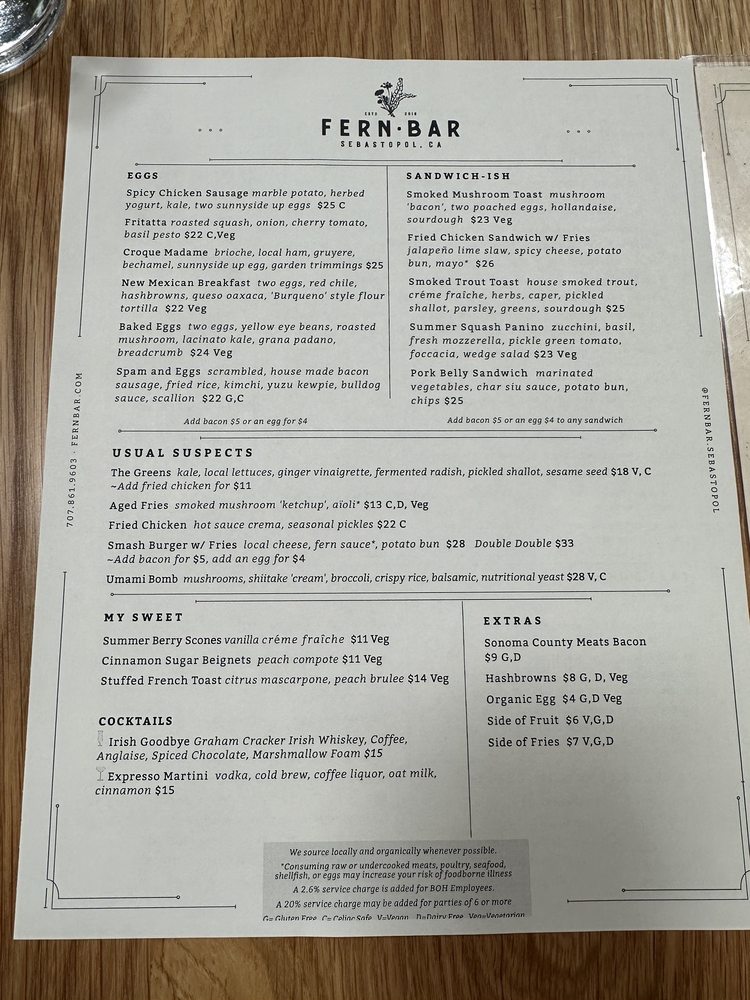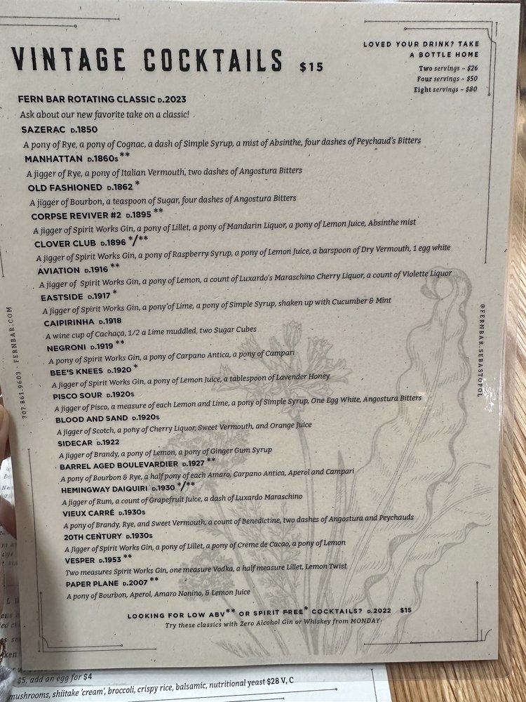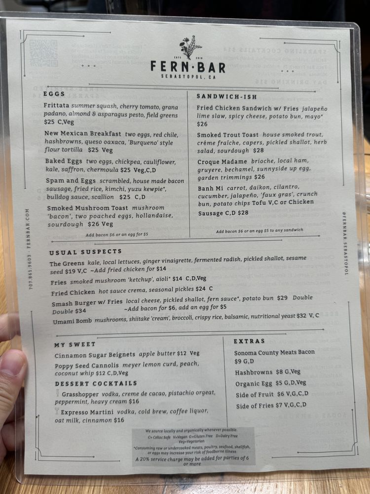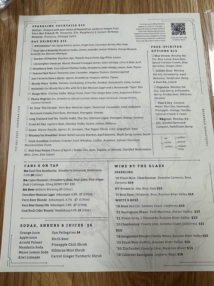 Nestled in Sebastopol, CA, Fern Bar exudes a trendy, upscale vibe perfect for a night out. This women-owned establishment boasts a varied menu with Pescatarian, Vegan, and limited Vegetarian options. The Fried Chicken is a standout, marinated in buttermilk and hot sauce, and served with a house blend of gluten-free flours. The atmosphere is cozy, with soft lighting and attentive service. Happy Hour specials and a full bar add to the appeal, making it ideal for gatherings. Customers rave about the delicious food, with Darcy A. hailing the experience as enjoyable and Gin K. appreciating the gluten-free vegan options. Fern Bar truly delivers on both ambiance and culinary delights.